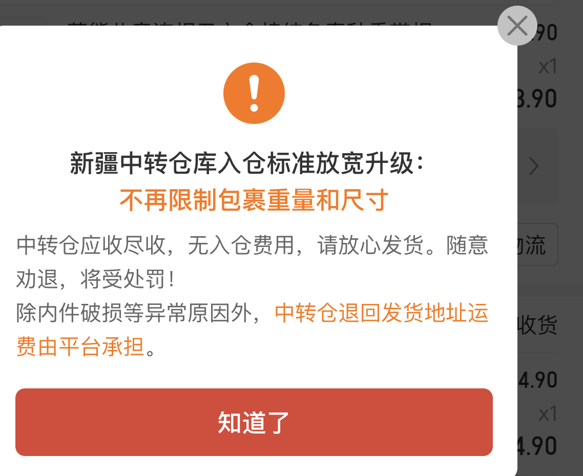 拼多多新疆中转仓库入仓标准放宽升级 拼多多 7月10日 辉哥站长/COO 取消关注 关注 私信 拼多多新疆中转仓库入仓标准放宽升级,不再限制包裹重量和尺寸。除内件破损等原因,中转仓退回发货地运费平台承担。